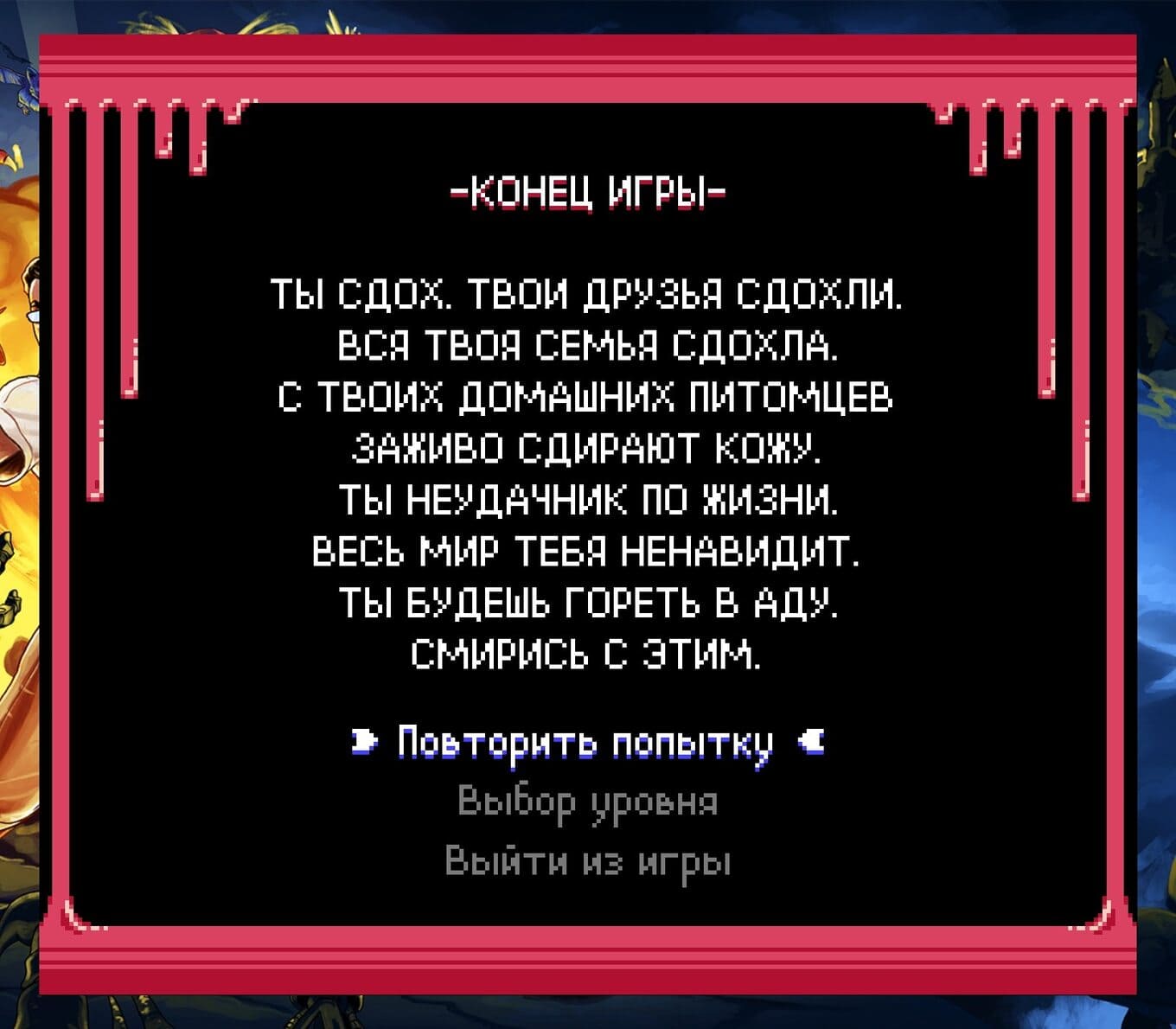 - Выбирайте свой стиль страдания и испытайте нервы в пиксельном аду, где каждая смерть сопровождается сарказмом.