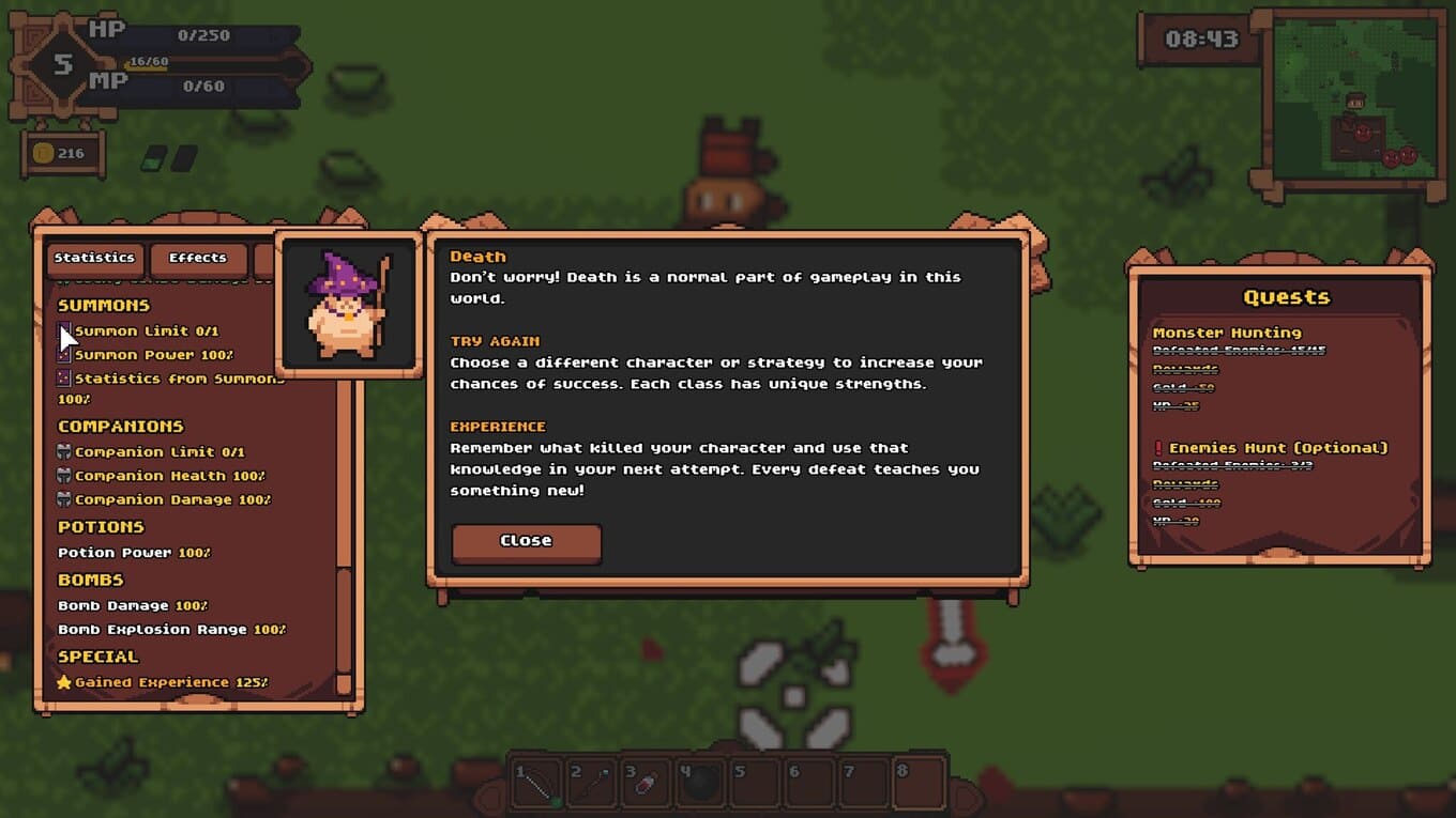 - При каждом повышении уровня игроку предлагается выбрать одну из 30 карт улучшений, формирующих индивидуальный билд.