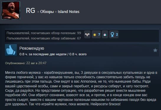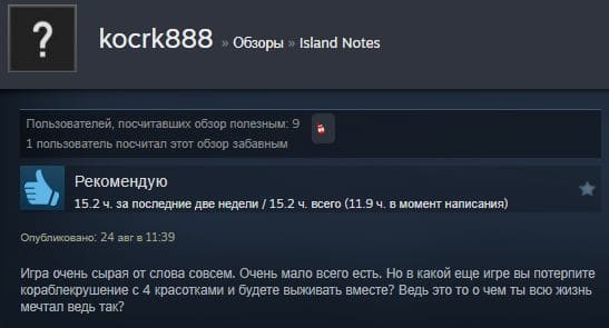 Island Notes – история выживания и человеческих связей, начинающаяся с кораблекрушения. Протагонист вместе с небольшой группой людей оказывается на таинственном острове, полном опасностей и скрытых возможностей. С первых минут игроку предстоит решить: сосредоточиться на собственном спасении или взять на себя ответственность за остальных. Основные механики строятся вокруг выживания: возведение убежища, выращивание пищи, рыбалка и поиск ресурсов.
