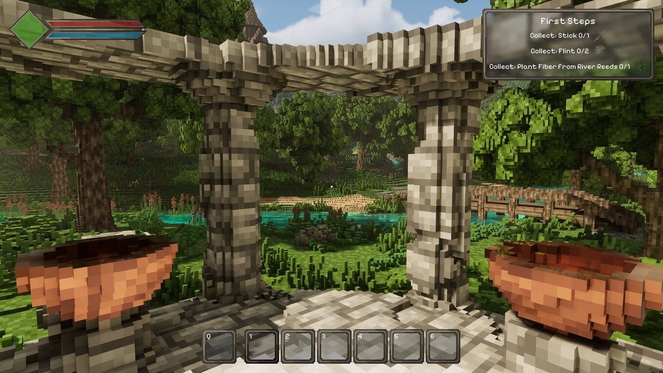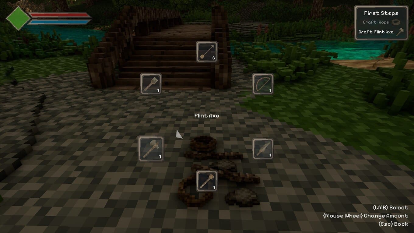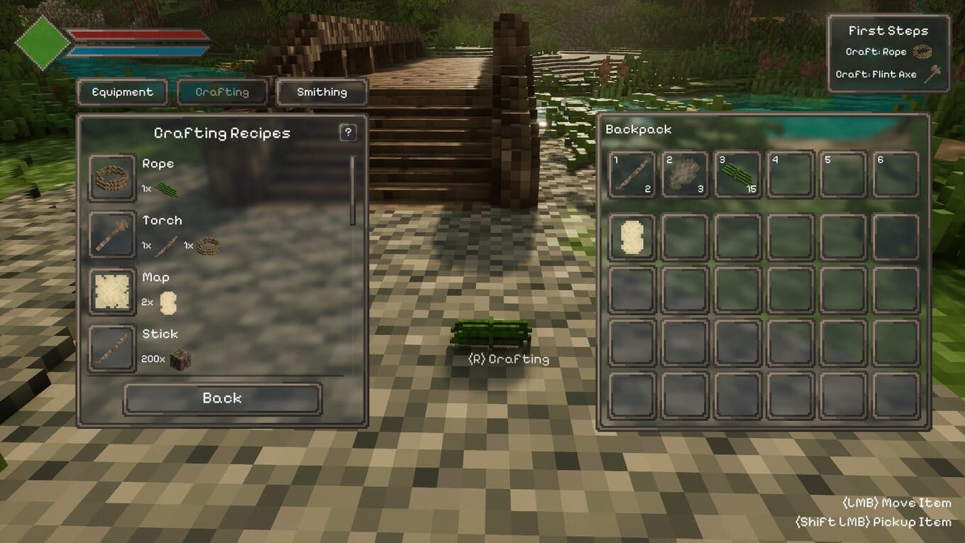 - Нужно физически соединять нужные материалы прямо в мире – этот подход распространяется на все: от оружия до пищи и экипировки;