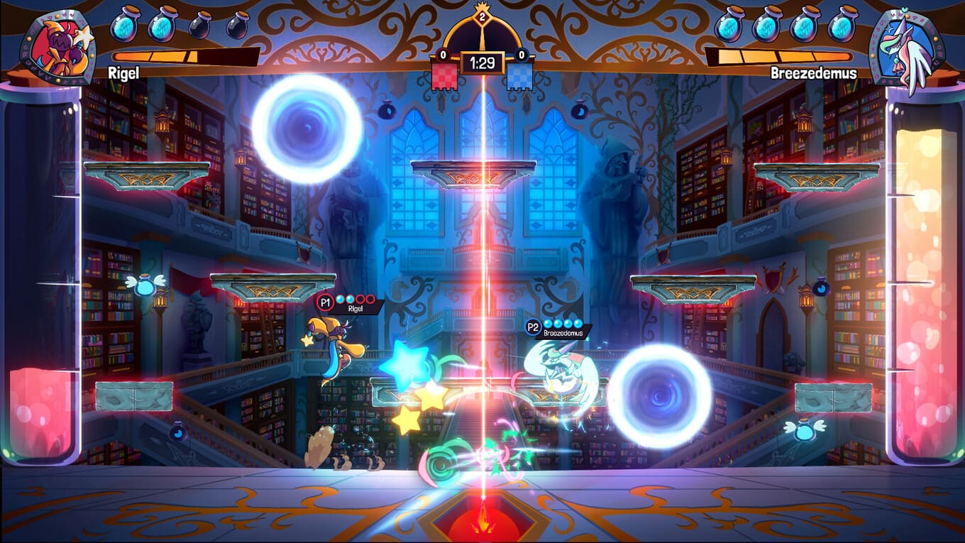 - Битвы проходят на многоуровневых аренах, где приходится не только метко бросать заклинания и зелья, но и ловко перемещаться по платформам;