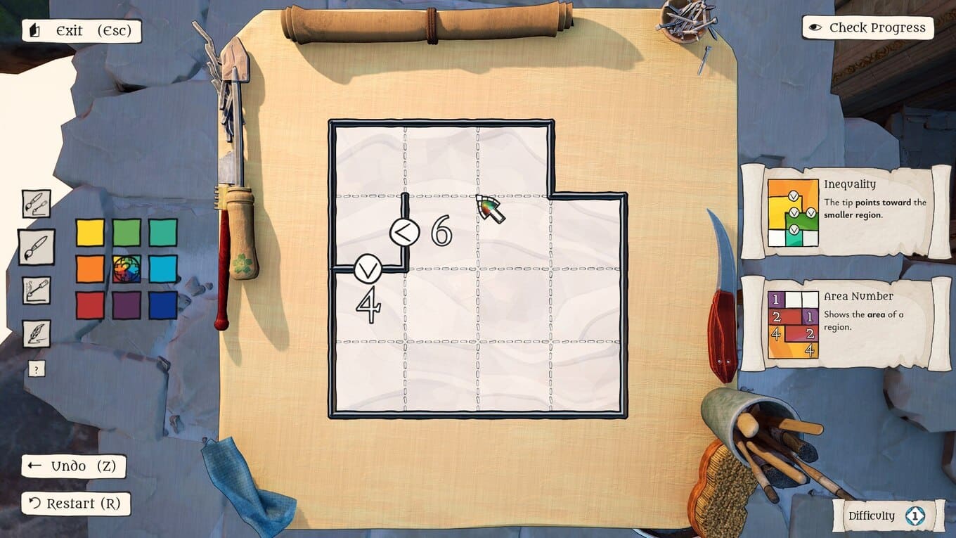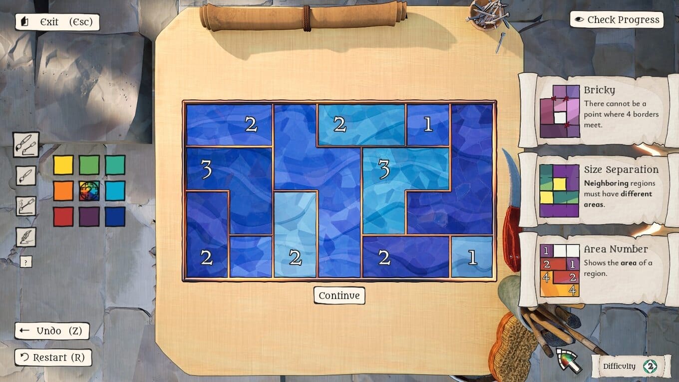 The Artisan of Glimmith – головоломка с медитативным ритмом, где игроку предстоит восстанавливать величественные витражные панно, опираясь на логику и внимательный анализ. Каждый уровень – это сложная задача, требующая точных умозаключений и грамотного использования доступных инструментов. В распоряжении игрока находится гибкая система вспомогательных средств: можно делать заметки прямо на игровой сетке, выделять важные элементы с помощью контуров и временно закрашивать неопределенные зоны, чтобы упростить дальнейший анализ. По мере прохождения сложность постепенно возрастает – от легких задач до серьезных испытаний, требующих полной концентрации и стратегического мышления. Несмотря на разнообразие цветов и форм, каждое решение всегда строго определено логикой.