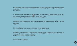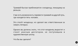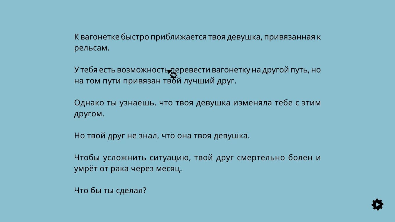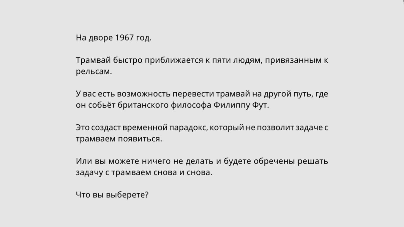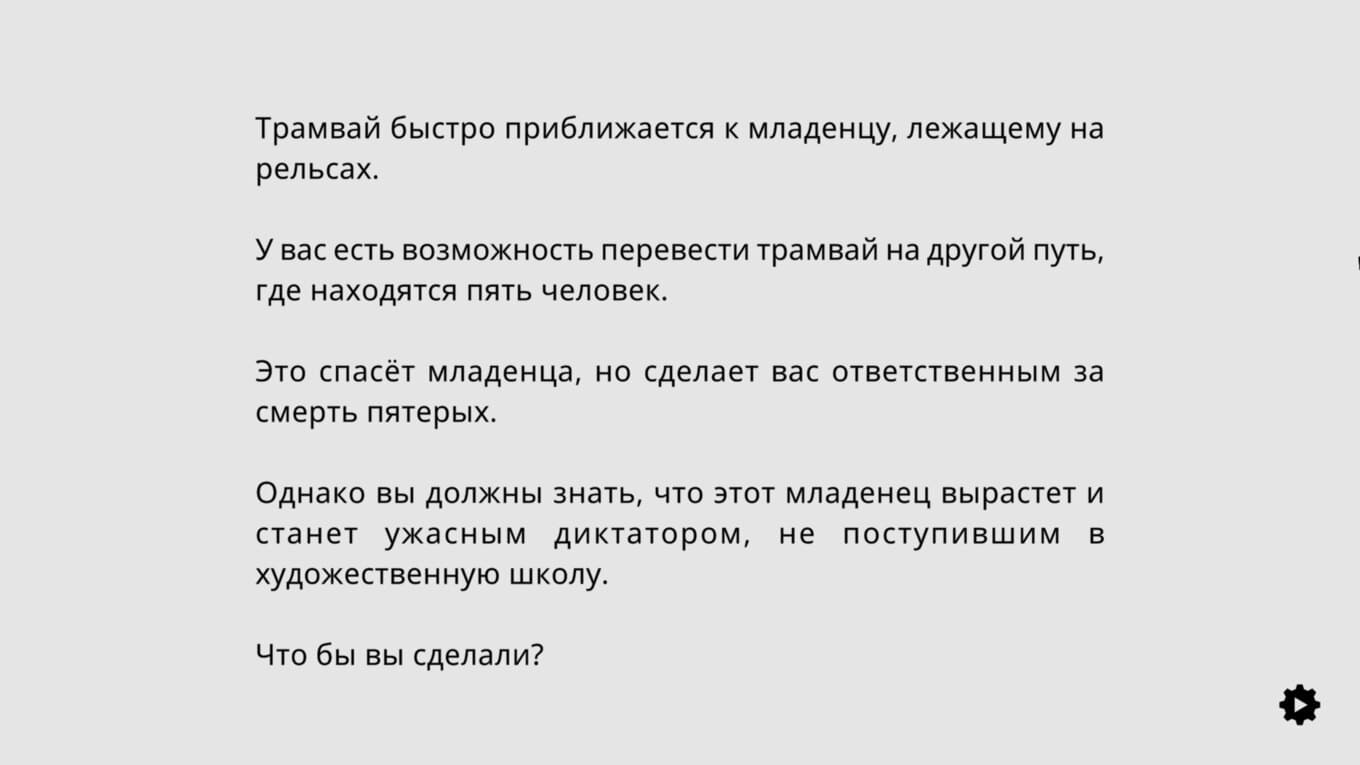 The Trolley Solution – интерактивная игра, где предлагается примерить на себе роль судьи в череде провокационных моральных ситуаций. Вдохновляясь знаменитым философским парадоксом, проект переосмысливает его с неожиданной стороны, предлагая десятки вариаций одной и той же дилеммы. Каждый сценарий – отдельный эксперимент, вынуждающий принять решение в условиях абсурда, иронии и намеренно гиперболизированных последствий. Сатирический тон и элементы черного юмора превращают сухие этические рассуждения в наглядные, порой нелепые, но запоминающиеся сцены.