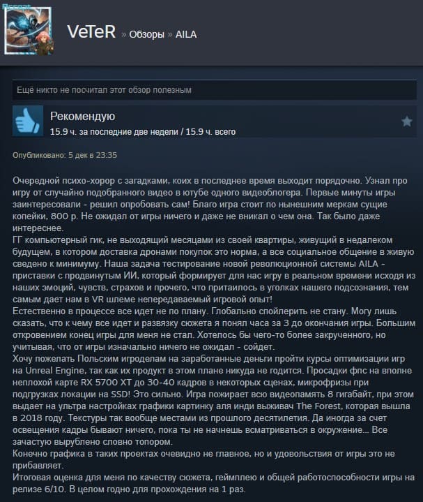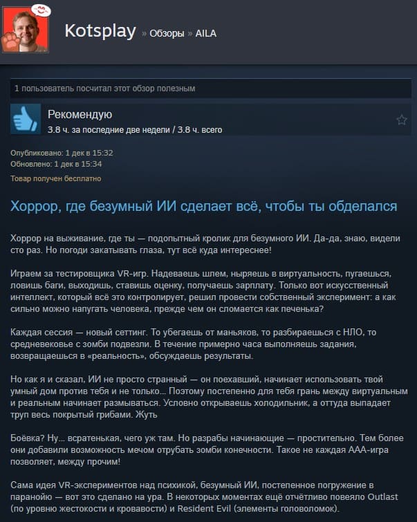 A.I.L.A – хоррор от 1-го лица, действие которого разворачивается в ближайшем будущем, где границы между реальностью и виртуальной симуляцией практически исчезли. Главный герой, Сэмюэл С., единственный тестировщик нового поколения видеоигр, получает задание оценить возможности революционного ИИ. Система сканирует самые глубокие страхи пользователя и на их основе создает уникальные, по-настоящему пугающие сценарии.