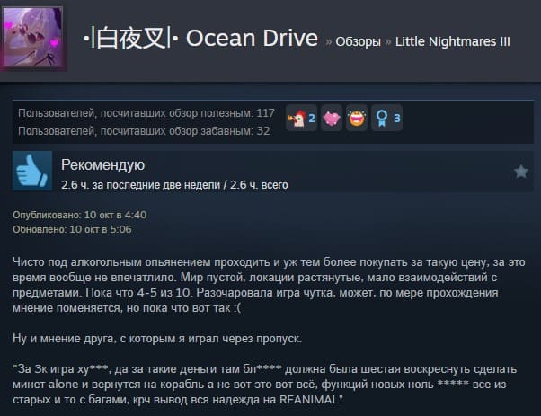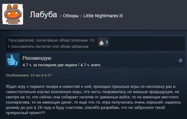 - GoFragRu: misha, https://store.steampowered.com/app/1392860/Little_Nightmares_III/