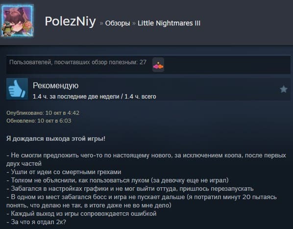 - GoFragRu: gleb, Здравствуйте! Отсутствие звука в Little Nightmares 3 чаще всего связано с настройками аудио или повреждённым конфигом.