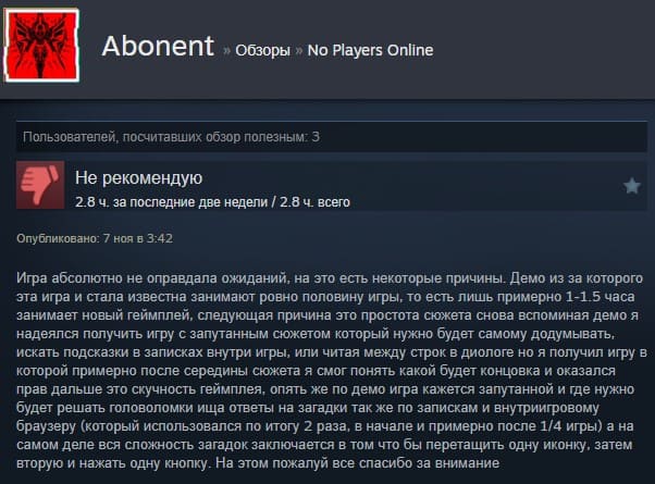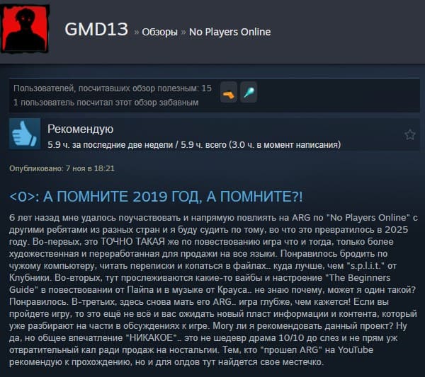 No Players Online – это не просто шутер от 1-го лица: старый компьютер превращается в портал в загадочный виртуальный мир. Оказавшись внутри заброшенной игры, вы постепенно раскрываете скрытые тайны, которые прячутся за привычной оболочкой старой многопользовательской арены. То, что сначала выглядит как стандартная игра 90-х, оказывается лишь поверхностным фасадом, за которым скрывается странная и тревожная история.