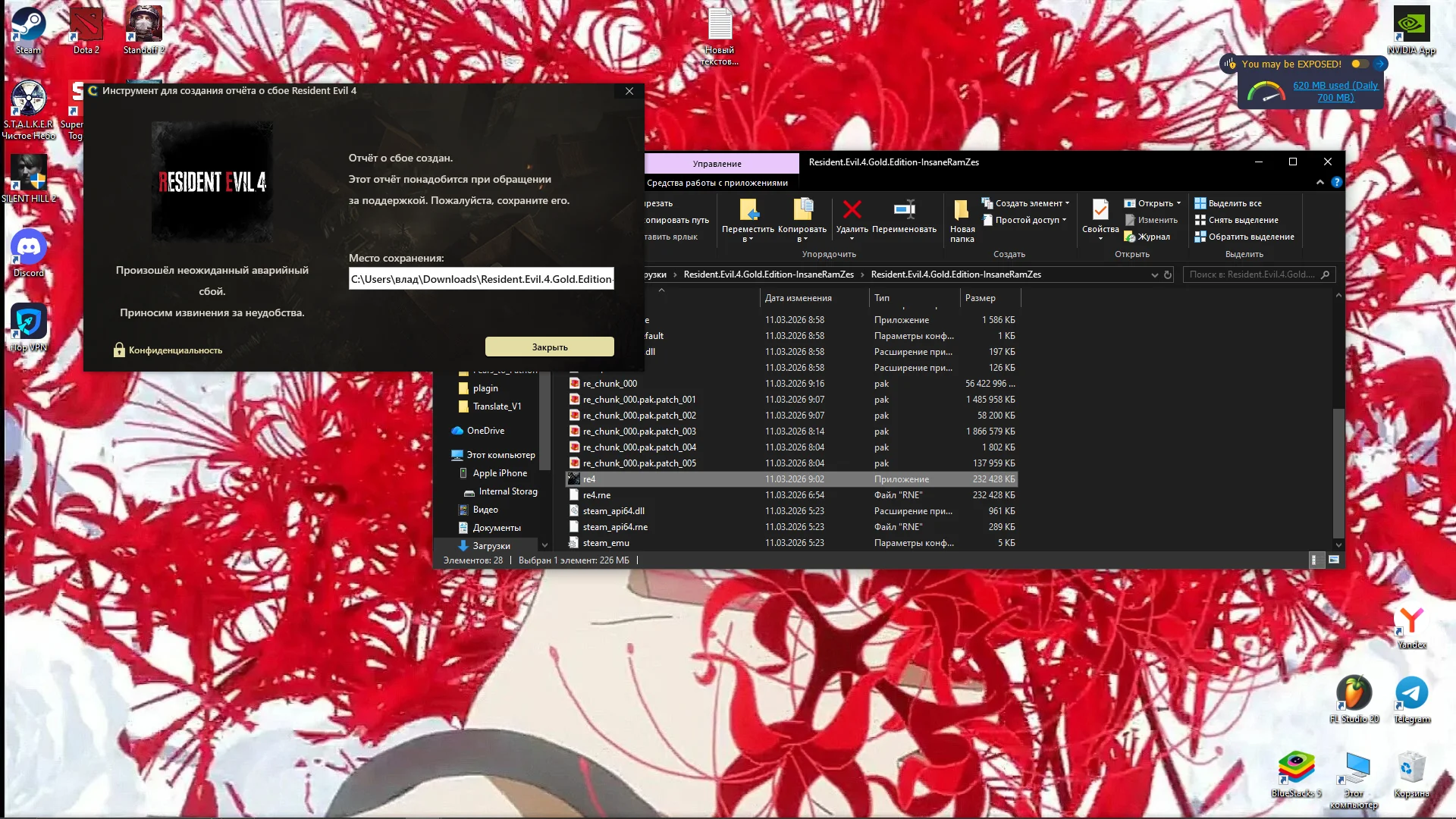 Игре не хватает видеопамяти (VRAM). Снизьте «Качество текстур» до «Высокое (1 ГБ)» или «Среднее» и отключите трассировку лучей (Ray Tracing) в настройках графики - она съедает 1-2 ГБ VRAM. Также убедитесь, что игра не запускается из длинного вложенного пути вроде «Загрузки» - перенесите её в D:\Games\RE4.