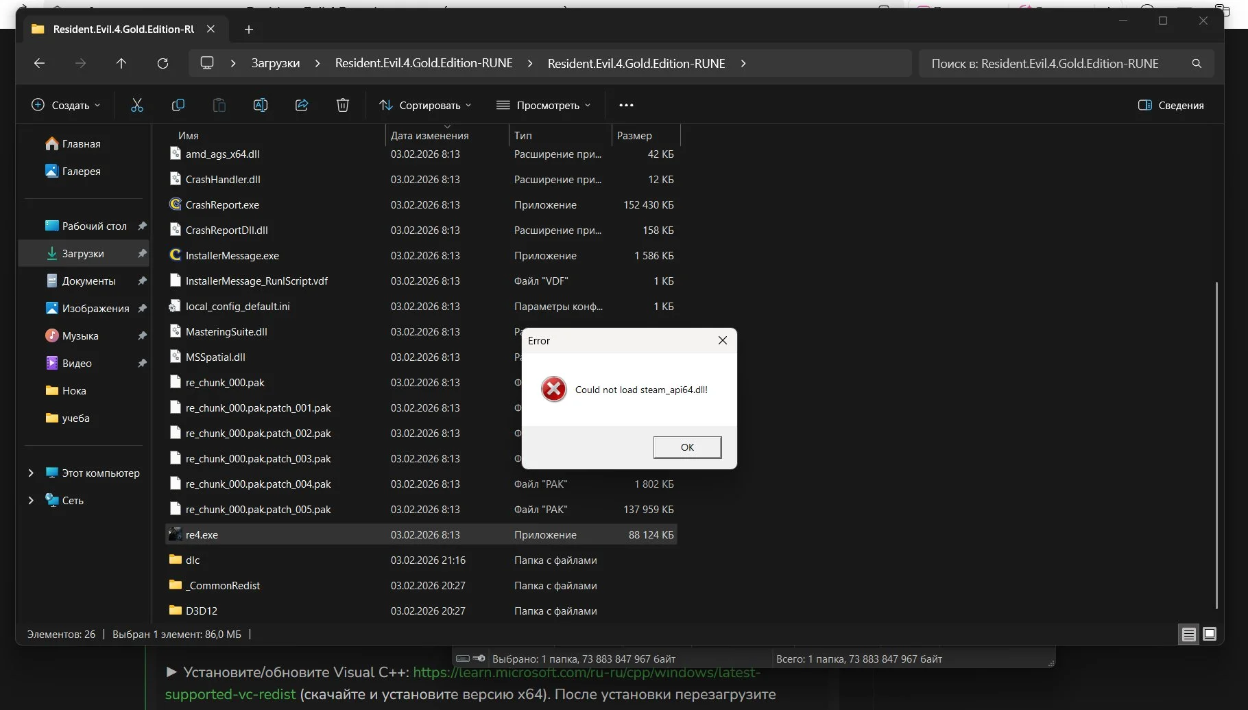 Три частых причины: не хватает места на диске C (нужно 60-70 ГБ для временных файлов), архив открыт двойным кликом вместо правой кнопки → «Извлечь в Resident.Evil.4...», или архив повреждён при скачивании. Пересчитайте хеш раздачи в торрент-клиенте и обновите архиватор или используйте 7-Zip (7-zip.org).