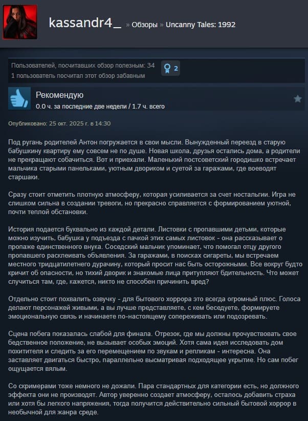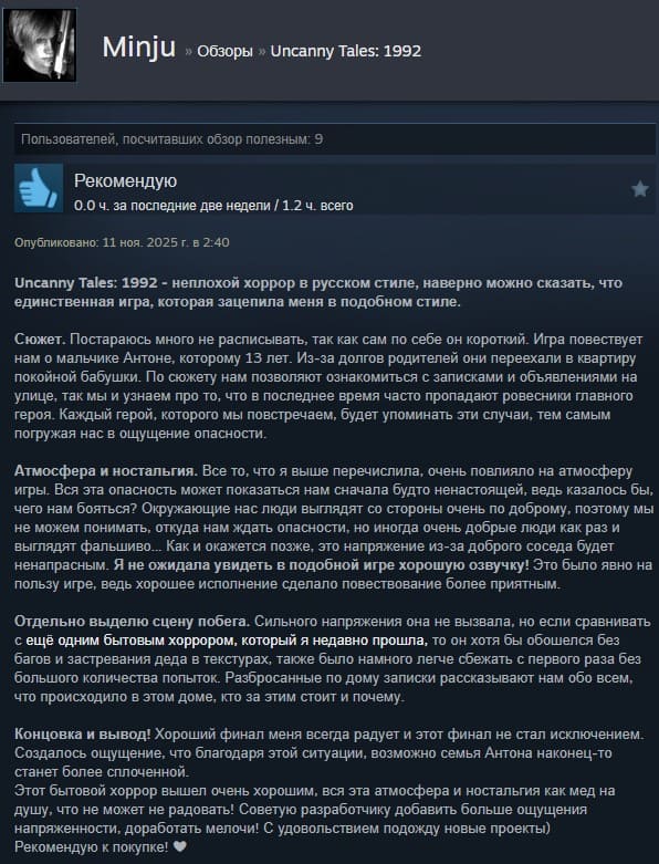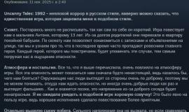 Uncanny Tales: 1992 – приключение с элементами психологического триллера, в центре которого оказывается 14-летний Антон. После переезда в небольшой провинциальный город он остается один в квартире бабушки, пока его родители уезжают по делам. Осень 1992 года здесь окрашена не только в серые тона, но и в страх: город живет слухами о таинственных исчезновениях детей. Школы закрыты, улицы опустели, а полиция, похоже, бессильна перед надвигающейся угрозой. Герой втягивается в собственное расследование, где каждая мелочь может оказаться ключом к разгадке, а доверие к окружающим становится роскошью.