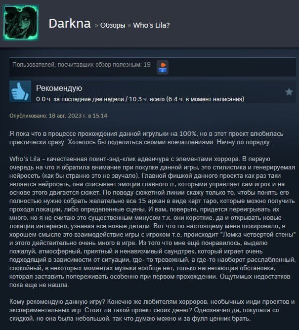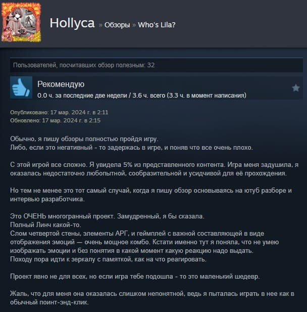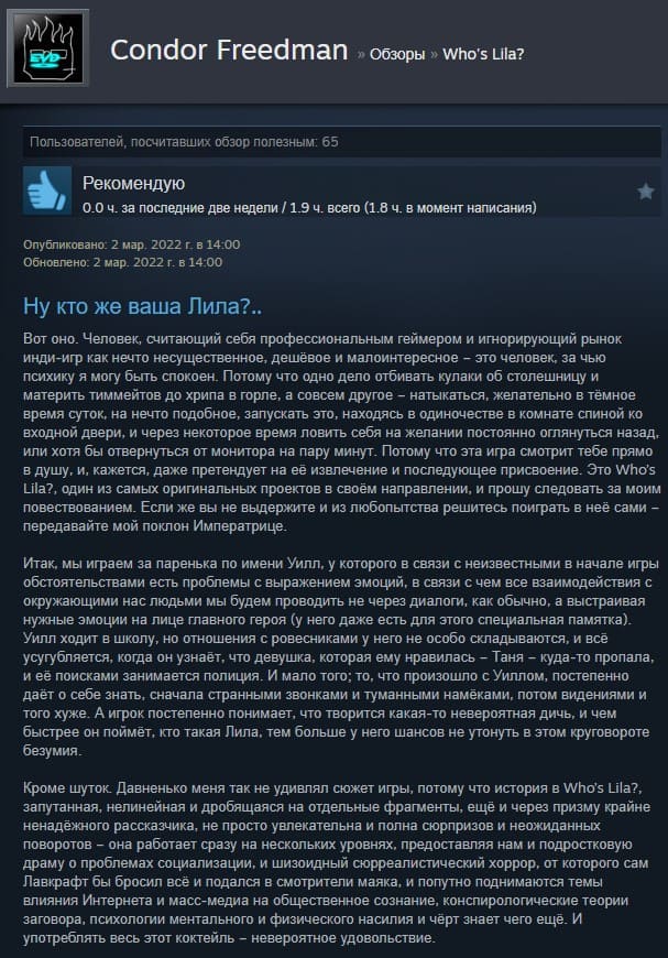 Who's Lila? – это мрачная и тревожная история, представленная в форме необычного интерактивного расследования. Игрок оказывается в роли странного, отстраненного парня, чье лицо – главный инструмент влияния на происходящее. Вместо привычного выбора реплик, здесь нужно буквально «лепить» выражение героя: кривить губы, поднимать брови, расширять глаза, заставляя персонажа выглядеть радостным, испуганным, удивленным или совершенно безразличным. Именно эти эмоции определяют, как собеседники реагируют на Уильяма, и куда повернет сюжетный узел.