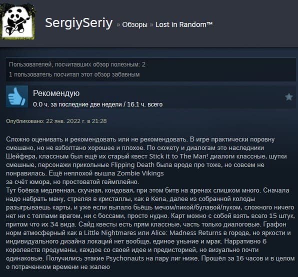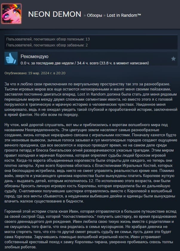Lost in Random – атмосферное приключение с элементами экшена, вдохновленное мрачной готической сказкой, где судьбы людей решаются броском костей. Действие разворачивается в странном королевстве Рэндом, находящемся под властью жестокой Королевы. Мир разделен на 6 зловещих регионов, и в каждом из них жизнь подчиняется капризам случая. Игроку предстоит отправиться в путь вместе с отважной девушкой по имени Эвен. Не имея ни богатства, ни поддержки, она решается на опасное путешествие, чтобы спасти свою сестру. На этом пути придется столкнуться с хаотичной природой Рэндома, постепенно раскрывая его древние тайны и скрытые истины.
