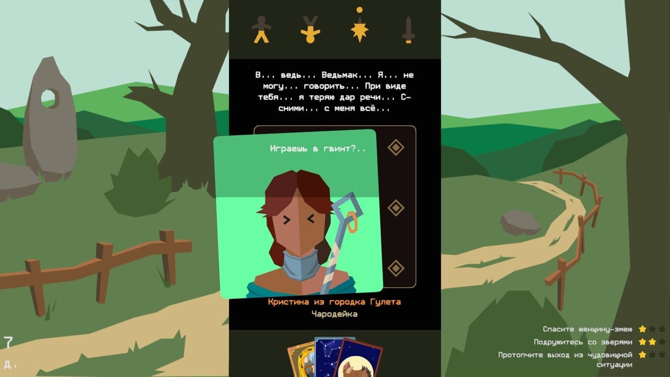 Reigns: The Witcher – ироничный взгляд на суровый мир Континента, где подвиги и трагедии Геральта из Ривии превращаются в преувеличенные и местами сомнительные истории, рассказанные неутомимым бардом Лютиком. Здесь мрачное фэнтези обретает гротескные черты, а судьба легендарного ведьмака решается не взмахом меча, а легким движением пальца по экрану. Вместо традиционных сражений игроку предлагается механика выбора: каждое решение – это смахивание карточки влево или вправо, способное привести к неожиданным последствиям.