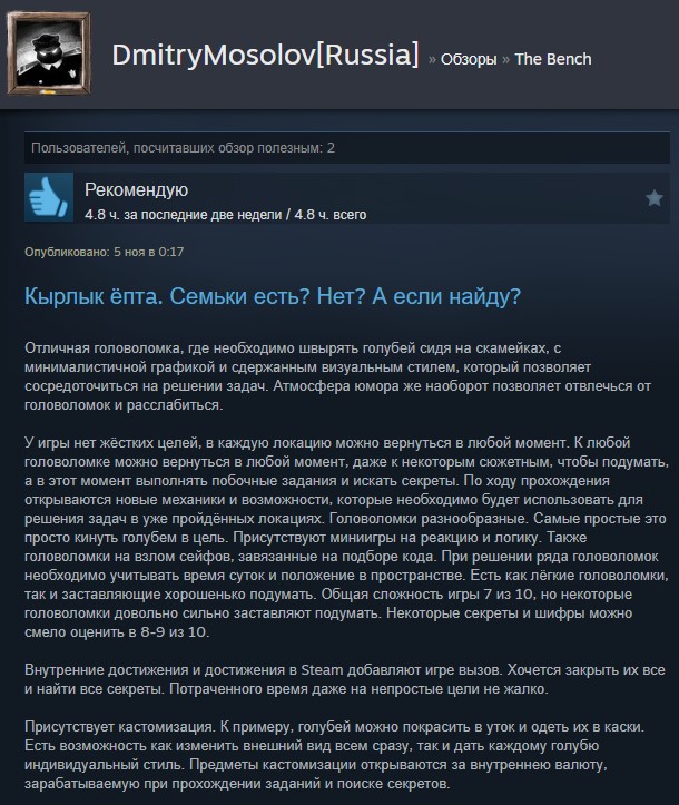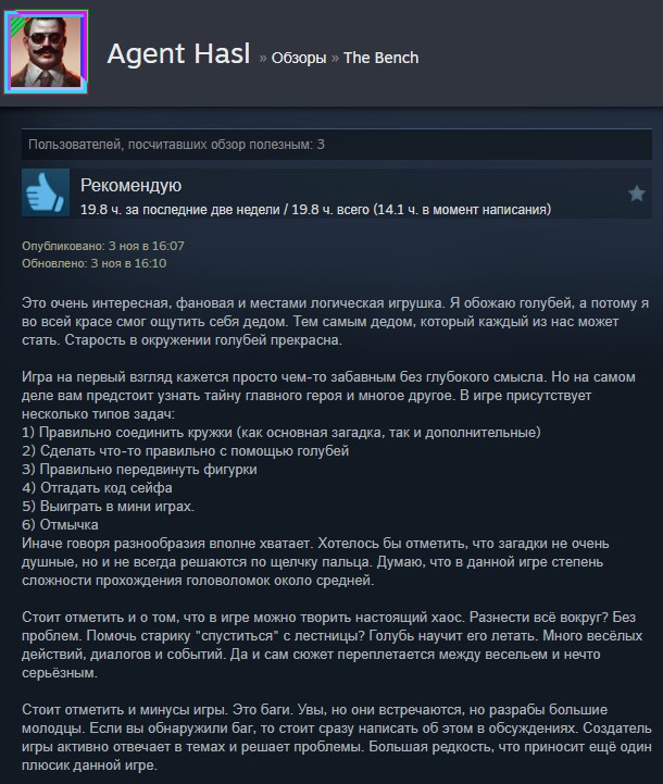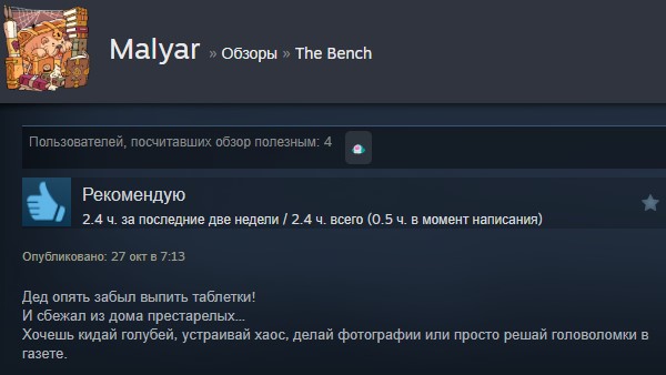 The Bench – в этой теплой и ироничной игре вы познакомитесь с пожилым мужчиной, который однажды решает покинуть однообразные будни дома престарелых и отправиться навстречу приключениям. Его верная трость, щедрые запасы хлеба и компания бесстрашных голубей становятся ключами к новому, удивительно живому миру. Перескакивая со скамейки на скамейку, герой открывает для себя город, полный красок, неожиданных встреч и тихих радостей. Каждый шаг – это не просто путешествие по улицам, но и путь в собственные воспоминания: обрывки прошлого постепенно складываются в трогательную историю о любви, потере и надежде.