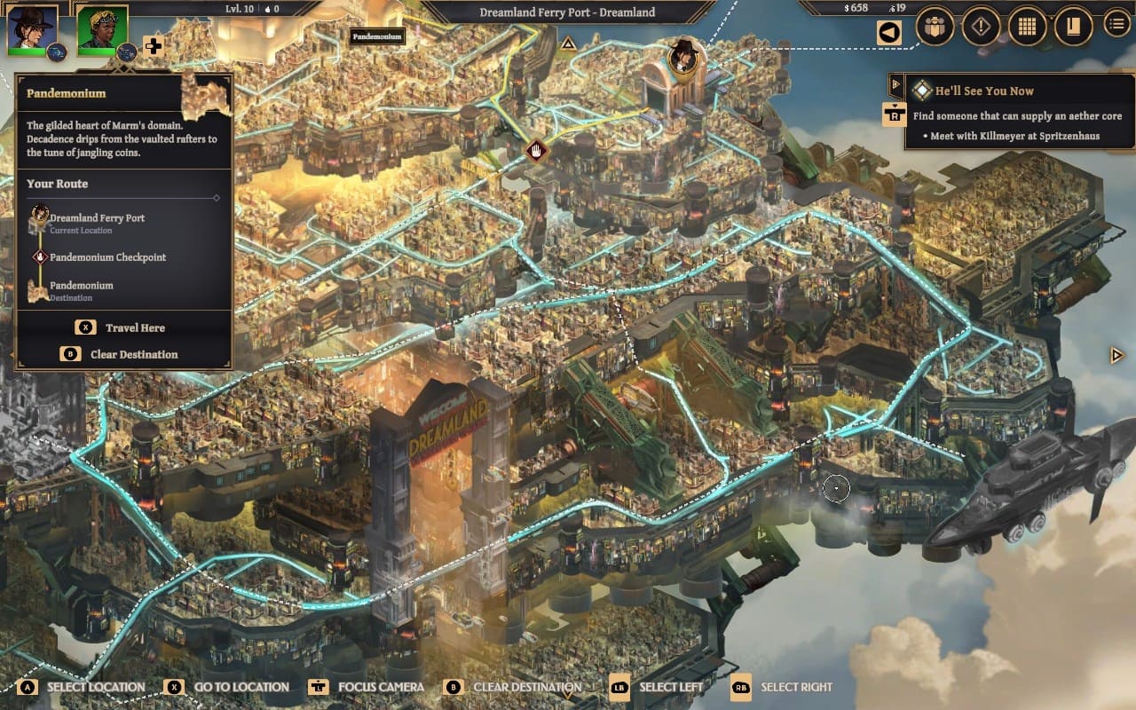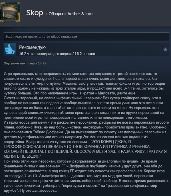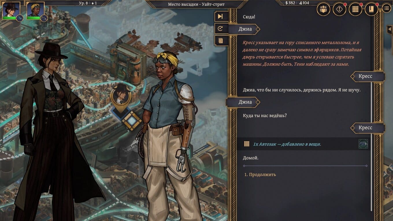 Aether and Iron переносит игрока в искаженную версию Нью-Йорка 30-х годов – город, где законы физики уступили место эфиру, загадочной субстанции, поднявшей улицы и небоскребы в небо. В этом парящем мегаполисе переплетаются мрачная эстетика нуара и дерзкий дух декадансного ретрофутуризма, создавая атмосферу опасности и технологического чуда. Главная героиня – Джиа Рандаццо, ловкая контрабандистка, привыкшая жить на грани закона. Одна случайная сделка втягивает ен в сложную сеть интриг, где на кону – судьба всего воздушного города.
