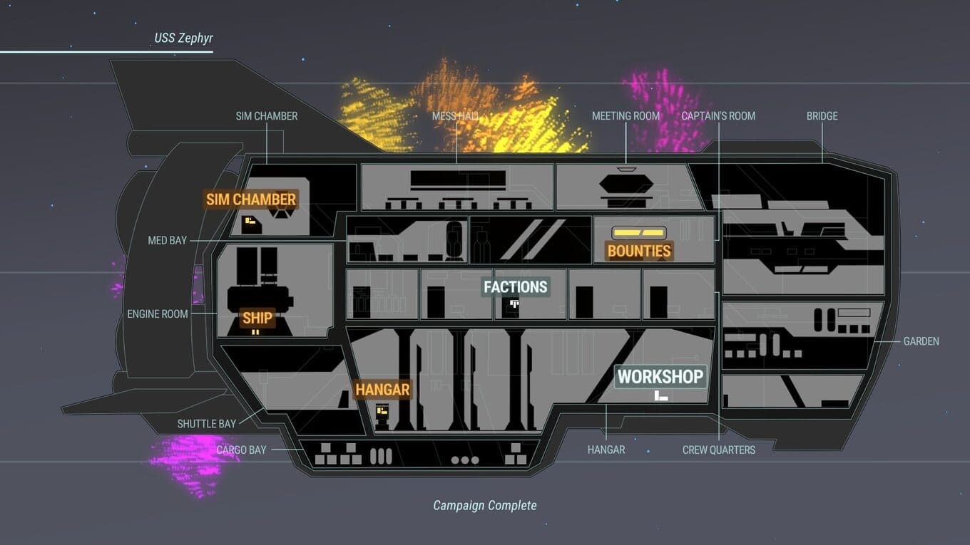- Перерывы между миссиями проходят на борту, который выступает полноценным штабом: здесь готовят карточные наборы, обучают пилотов, обсуждают стратегию.