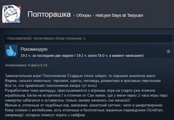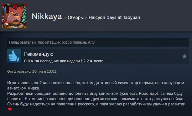 Halcyon Days at Taoyuan – симулятор спокойной жизни, где шум мегаполиса сменяется тишиной живописной деревни Таоюань. Здесь время течет мягко и неспешно, позволяя сосредоточиться на простых радостях, гармонии с природой и теплом человеческом общении. В центре игры – отношения с жителями деревни. Небольшое сообщество наполнено яркими личностями: у каждого героя свой характер, прошлое, взгляды и повседневные привычки. Общаясь, помогая и проявляя внимание, вы постепенно завоевываете доверие, влияете на их настроение и формируете крепкие связи.