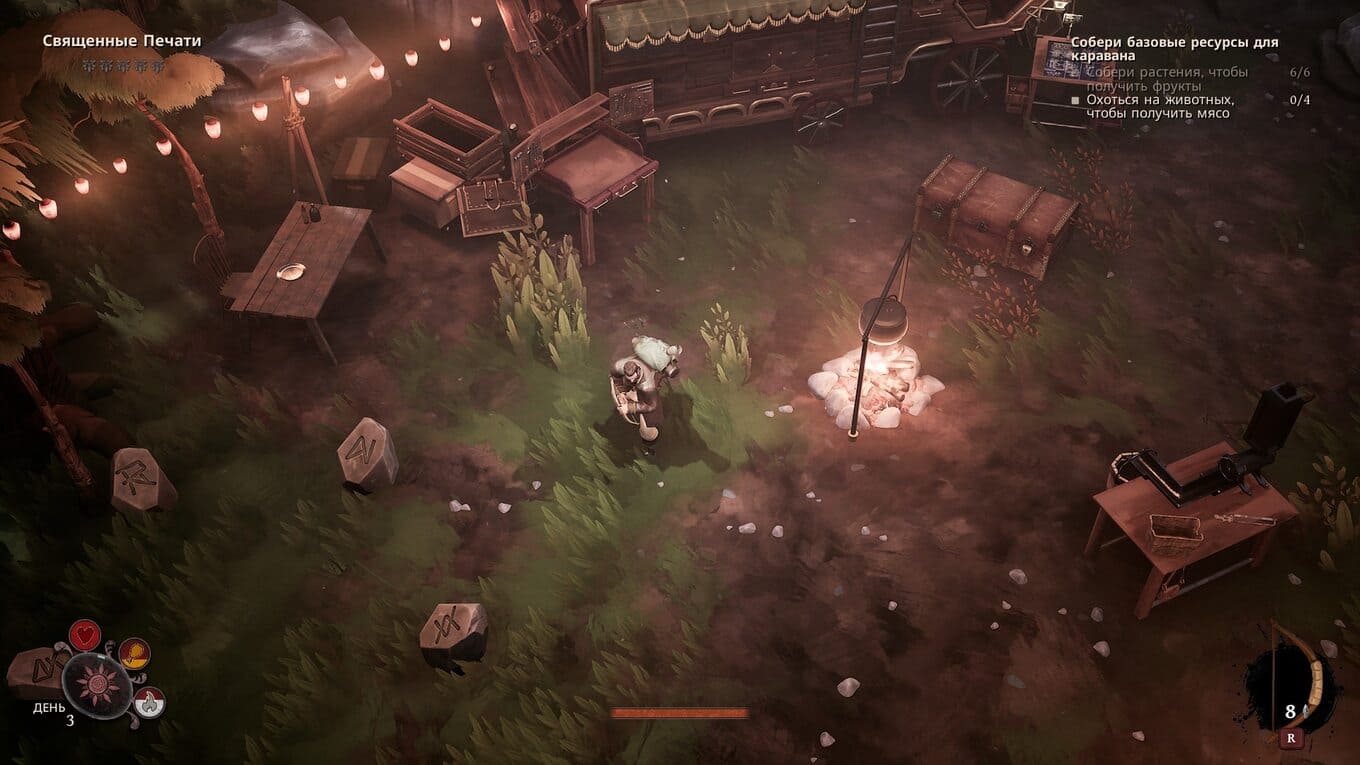 - В темноте на чужаков начинают охотиться божественные хранители этих земель. В такие часы выживание превращается в тонкий баланс между риском и возможной добычей;