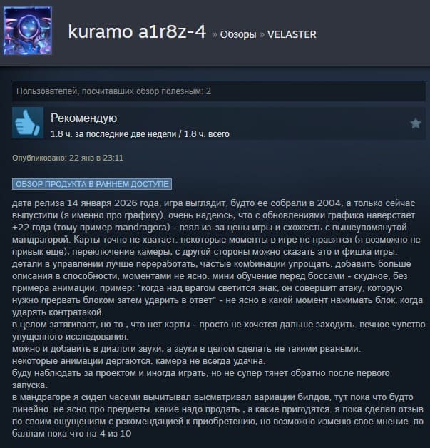VELASTER – сайд-скроллер в стиле соулслайк, который погружает игрока в мир опасных сражений и глубокого повествования. Главная особенность игры – возможность выбрать одного из 3-х героев, каждый со своим уникальным боевым стилем и набором навыков, что делает каждый проход свежим и требующим новых тактических решений. Бои напряженные и динамичные: каждое движение, удар или блок ощущаются с полной отдачей.