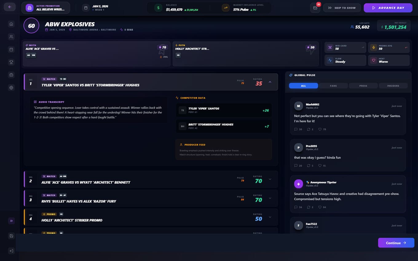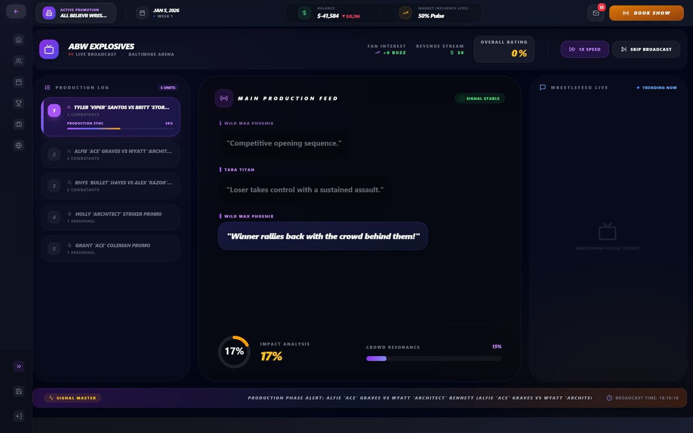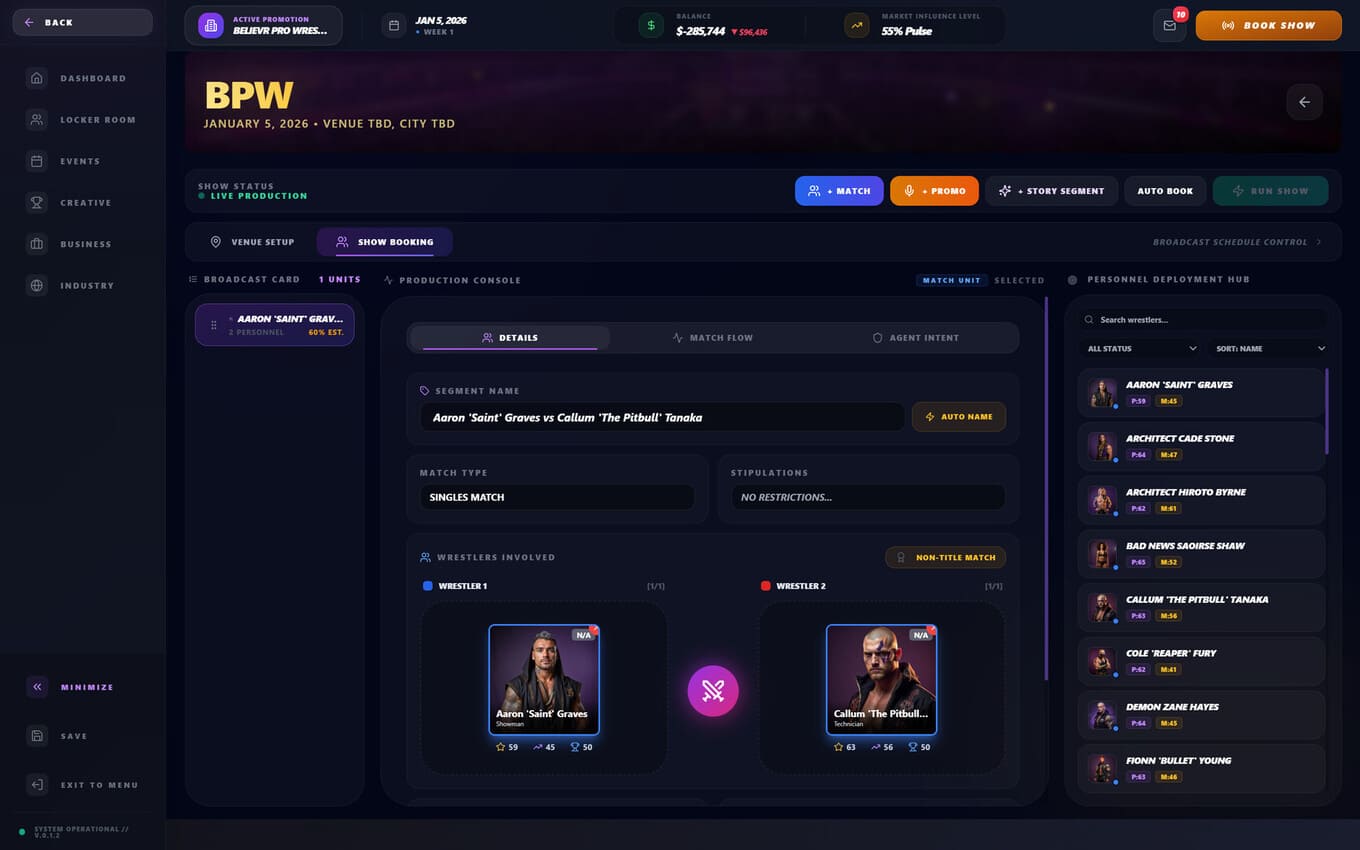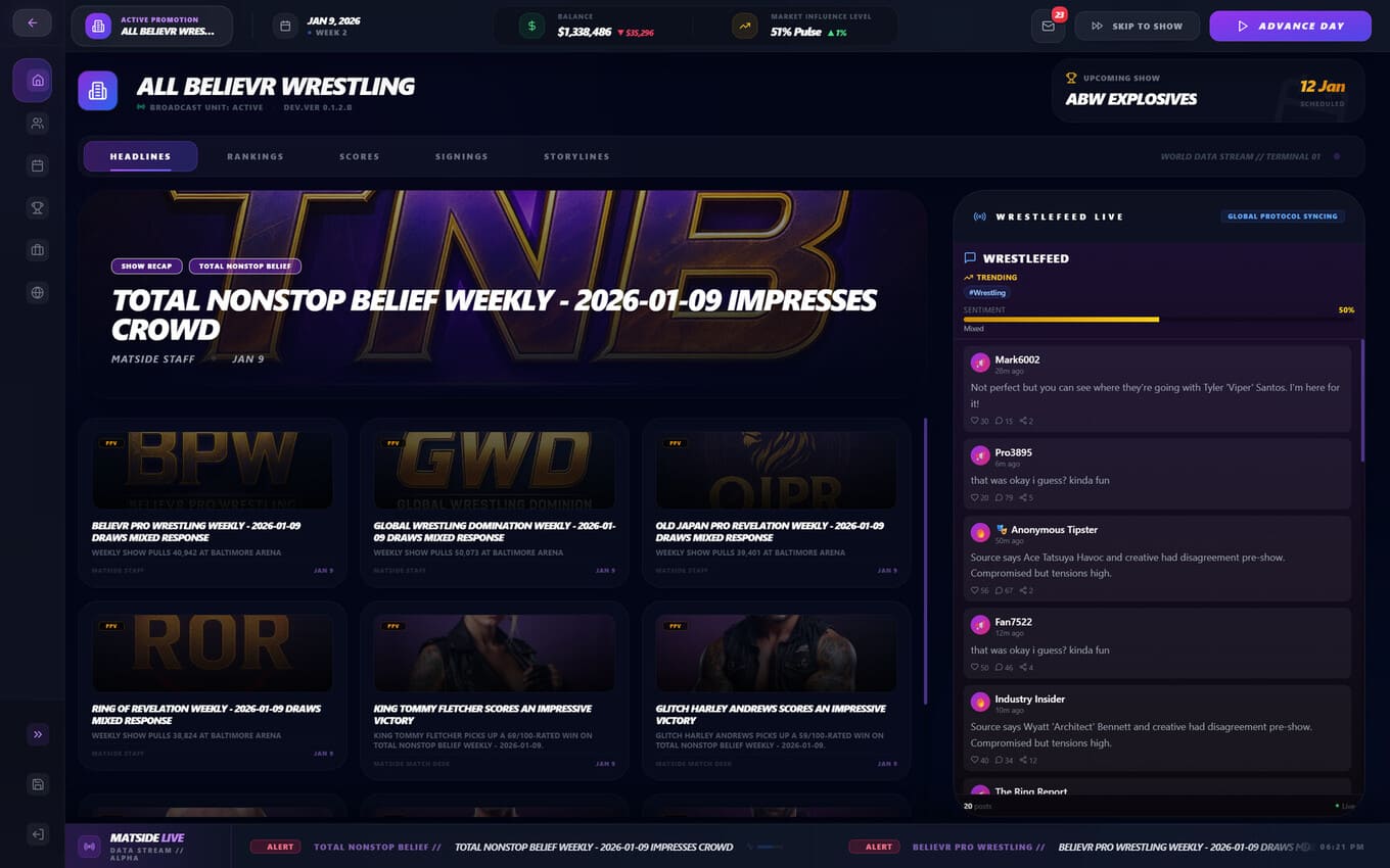 Believr Pro Wrestling – менеджерский симулятор, погружающий в закулисный мир профессионального рестлинга, где решающую роль играют не зрелищные кнопочные бои, а стратегическое мышление и долгосрочное планирование. Игрок берет на себя управление промоушеном, отвечая за организацию еженедельных шоу и масштабных PPV, каждое из которых может повлиять на будущее компании. Продвинутая система Match Flow позволяет конструировать поединки шаг за шагом: выбирать их характер, ритм и ключевые эпизоды, сохраняя баланс между зрелищностью и репутацией рестлеров.