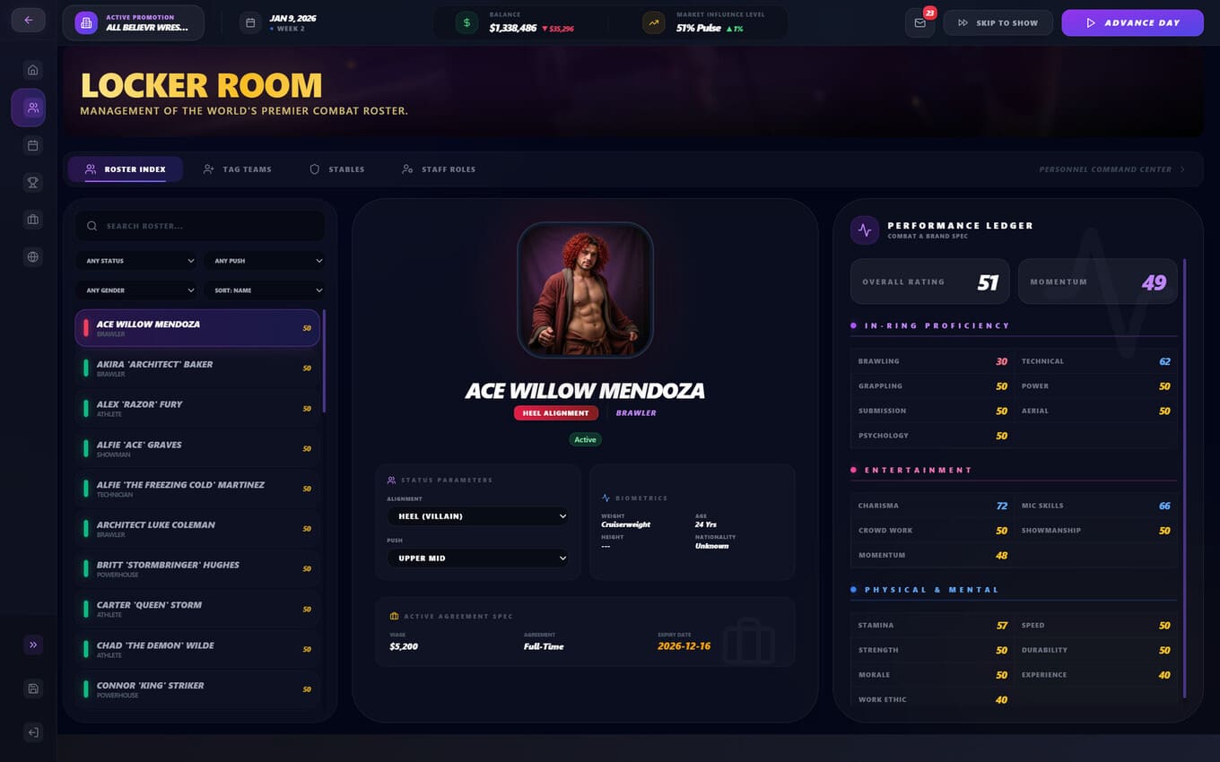- В распоряжении – разнообразный ростер бойцов с индивидуальными чертами характера, уровнем популярности, моральным состоянием и амбициями;