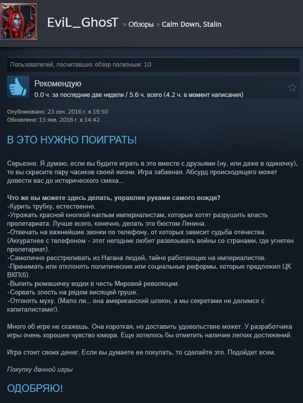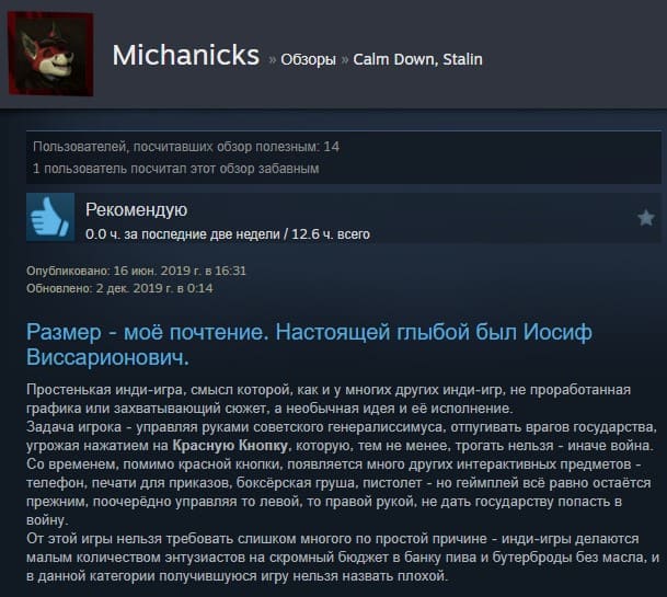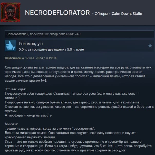 Calm Down, Stalin – ироничный симулятор, в котором предлагают примерить на себя роль лидера огромной державы и испытать на прочность собственные нервы. Проект, созданный небольшой инди-командой, подает серьезную тему через призму сатиры, обыгрывая известные исторические мотивы и доводя их до абсурда. Действие разворачивается в рабочем кабинете вождя, где вам не придется ходить или исследовать мир – все внимание сосредоточено на управлении руками персонажа.