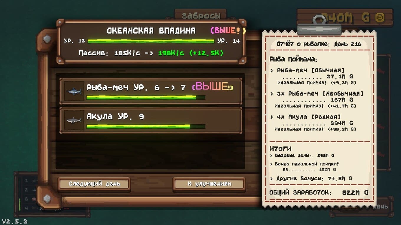 - С накоплением опыта игрок начинает лучше понимать поведение разных видов рыб, что повышает вероятность поимки редких и особенно крупных экземпляров;