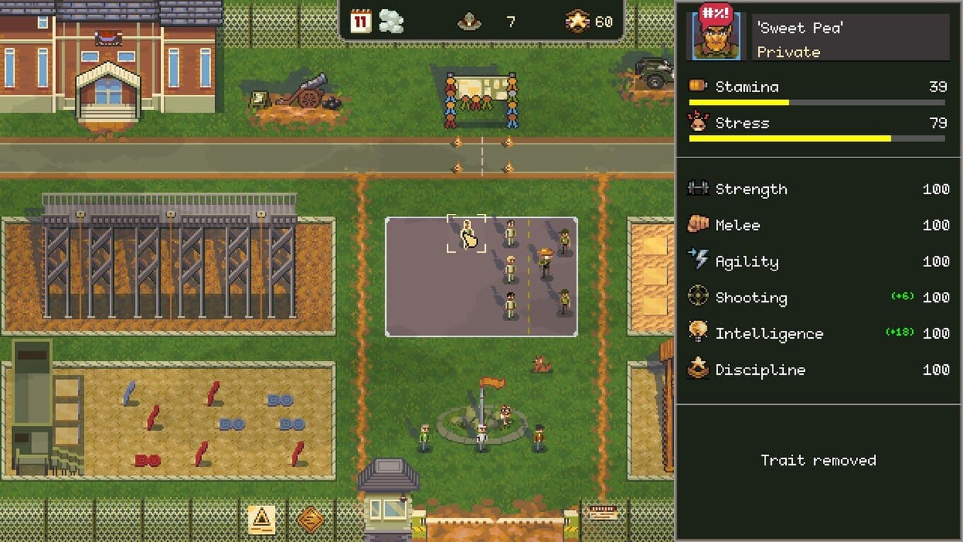 - Проект выделяется обновленным пиксельным стилем с детализированной анимацией, подчеркивающей суровую атмосферу военной подготовки;