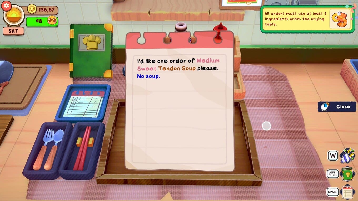 - Геймплей строится вокруг внимательной и почти медитативной работы с ингредиентами: игроку предстоит аккуратно нарезать продукты, следить за процессом варки и точно рассчитывать время обжарки;