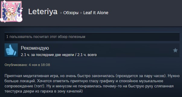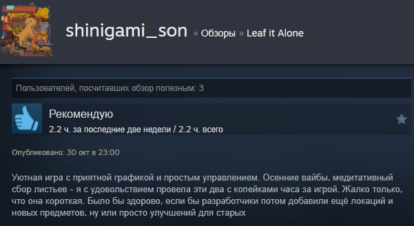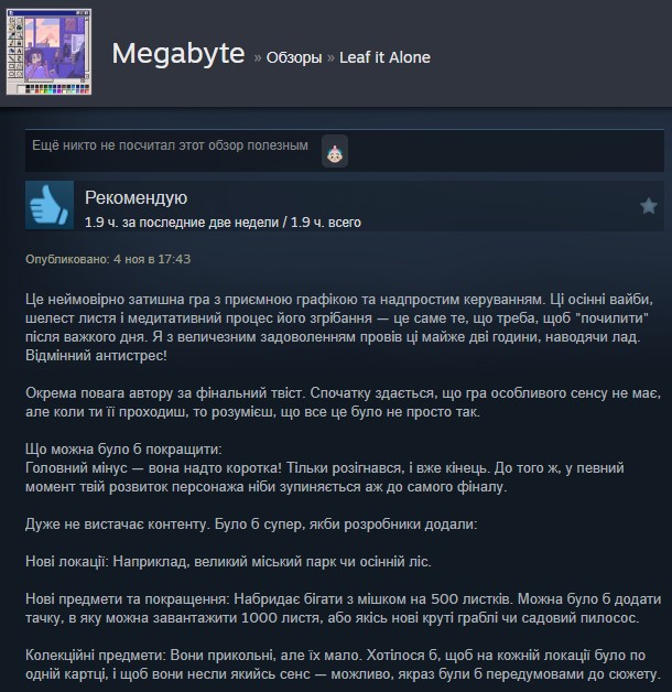 Leaf it Alone – расслабляющий симулятор уборки, где каждая тщательно очищенная зона двора приносит постоянные улучшения: более быстрый бег, ускоренное завязывание мешков и другие бонусы. Игровой арсенал включает грабли, мощную воздуходувку и возможность собирать листву вручную. Особенно увлекательно пользоваться граблями: на высоких уровнях они позволяют с легкостью стягивать большие кучи листьев одним плавным движением благодаря эффекту прилипания. Автоматические вентиляционные отверстия помогают ускорить процесс, всасывая ближайшую листву. Главная цель – открыть доступ к секретной комнате, которая служит своего рода финальной наградой.
