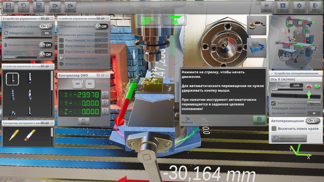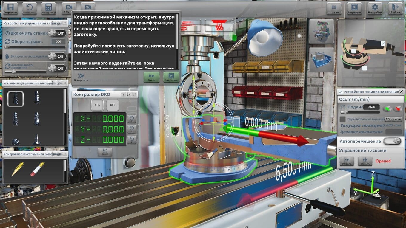 - Игроки шаг за шагом знакомятся с принципами работы станка, изучают элементы управления и осваивают базовые техники обработки;