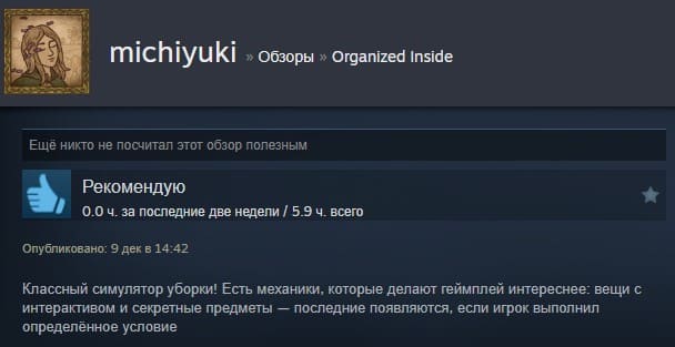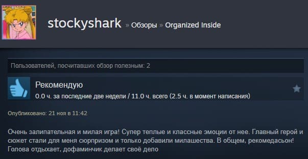 Organized Inside – головоломка, где наведение порядка превращается в тихий диалог с собой. Игра приглашает замедлиться и без давления заняться сортировкой повседневных вещей: здесь нет таймеров, подсчета очков или наказаний за ошибки. Вместо спешки – ощущение уюта, принятия и постепенного обретения внутреннего равновесия, когда хаос шаг за шагом уступает место гармонии. Сюжет развивается ненавязчиво и фрагментарно: через личные предметы раскрываются судьбы пяти незнакомых людей.