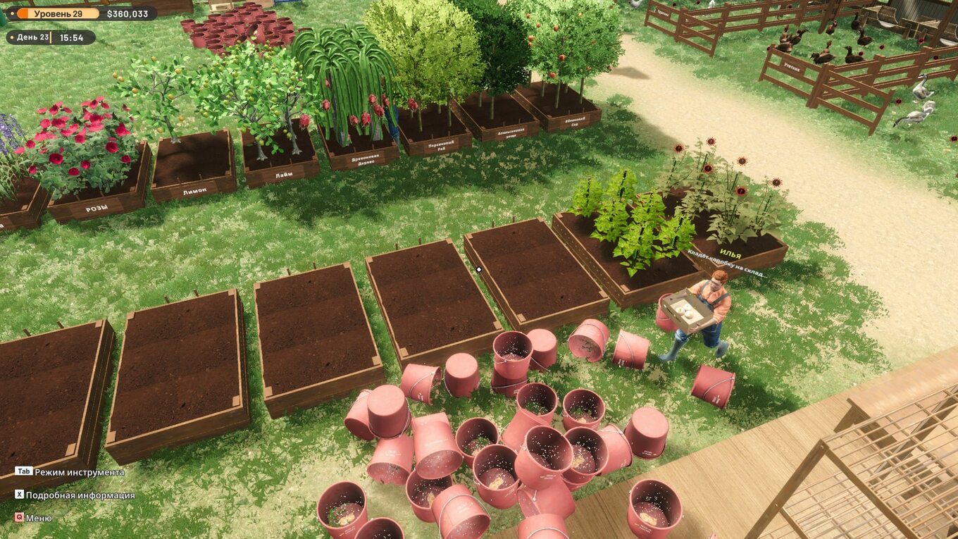 - Доступно растениеводство: игрок закупает саженцы овощей и фруктов, таких как чили, огурцы и яблони, подготавливает грядки, высаживает растения и следит за их развитием до сбора урожая;
