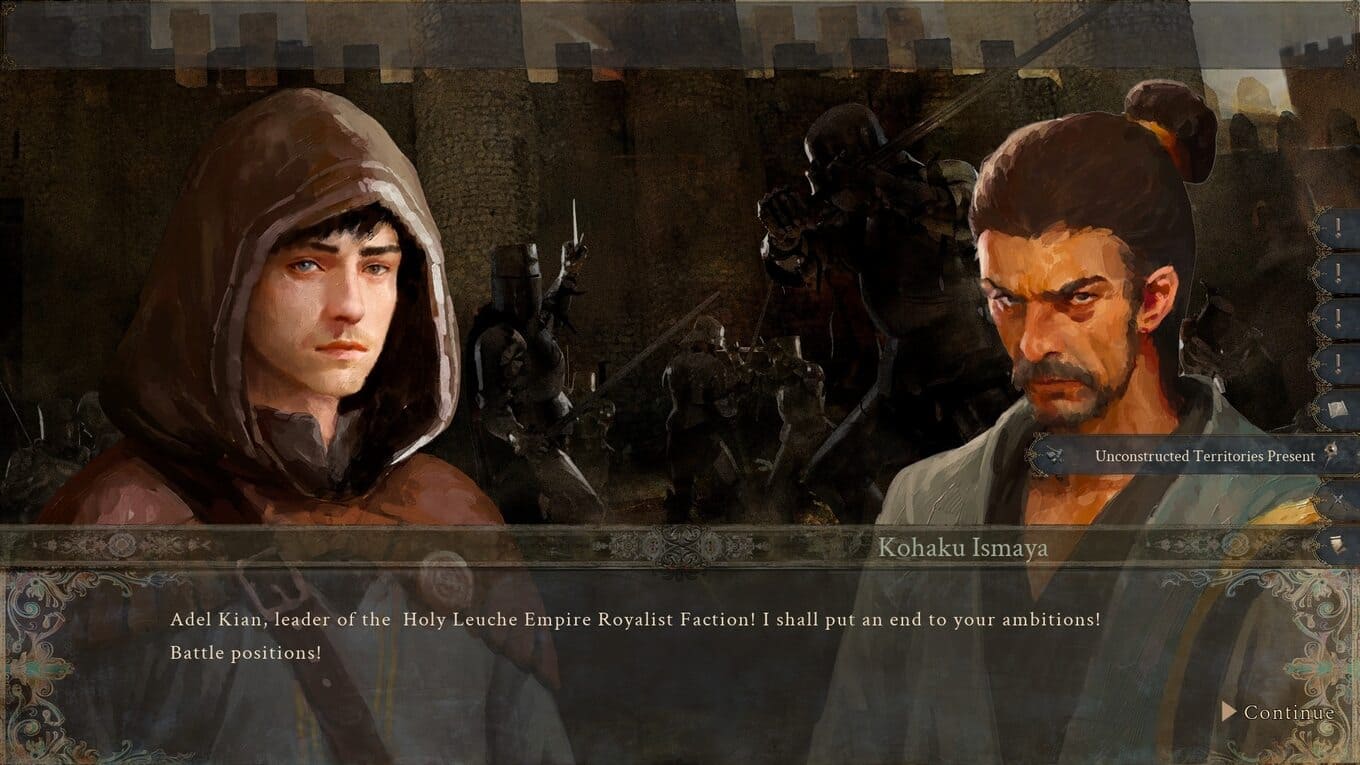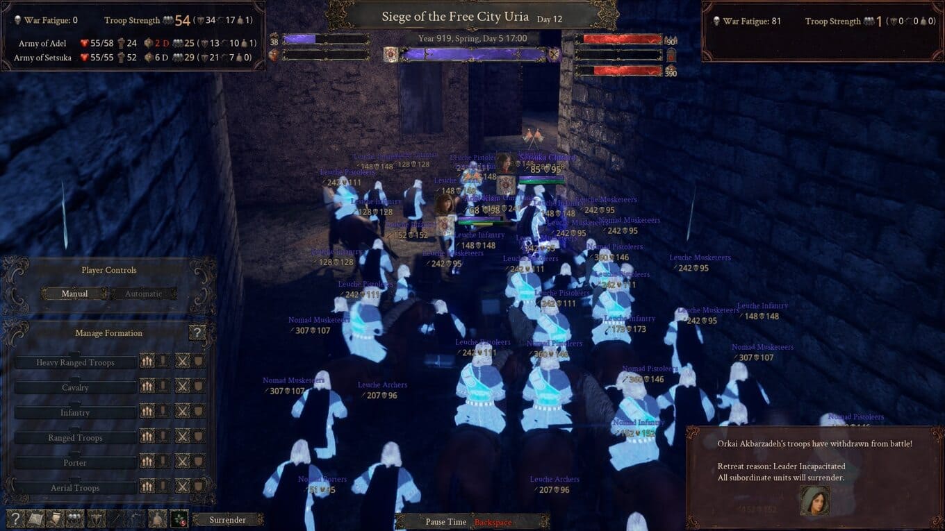 - Бои проходят в реальном времени и требуют продуманного размещения войск, грамотного использования формаций и учета обстановки.