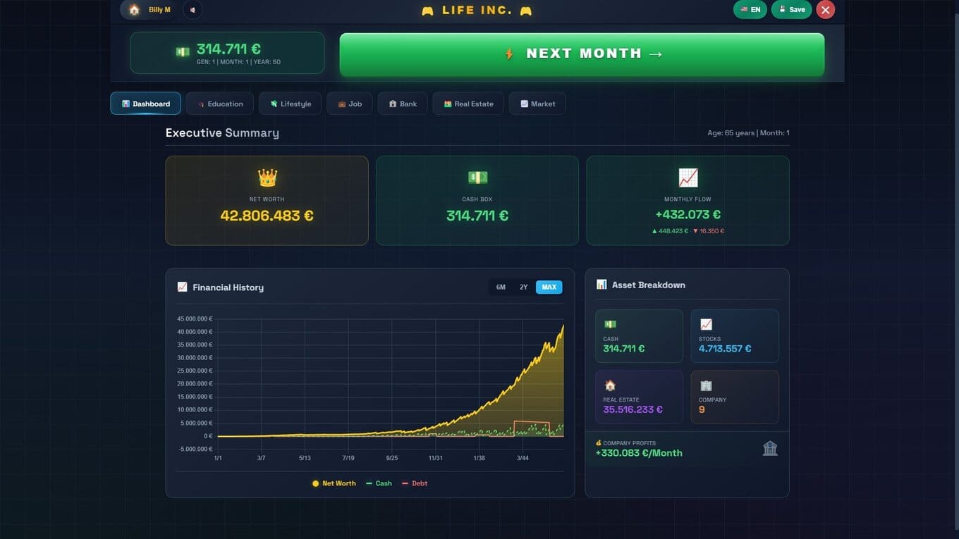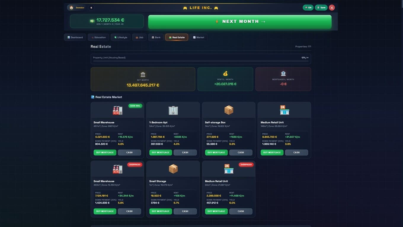 Life Inc – стратегия с глубоким экономическим уклоном, где каждое решение имеет финансовые последствия. Здесь деньги не появляются сами по себе: игроку приходится тщательно планировать бюджет, учитывая все – от повседневных покупок одежды до крупных вложений в недвижимость. Геймплей строится на постоянном балансе между расходами и доходами: налоги, ипотека, развитие бизнеса – все требует внимания и расчета. Управление собственной империей, например сетью ресторанов, предполагает продуманную ценовую политику и умение адаптироваться к рынку. Одновременно важно следить за колебаниями фондовых активов, чтобы создать стабильный источник пассивного дохода.
